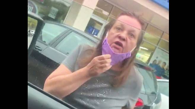 한 백인 여성이 차량 쪽으로 몸을 기댄 채 마스크를 내리고 욕설을 합니다.