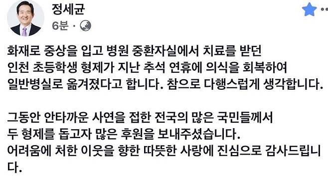 정 총리는 SNS 계정을 통해 이들 형제가 지난 추석 연휴, 일반 병실로 옮겨져 "참으로 다행스럽게 생각"한다고 밝힌 뒤 국민들의 많은 후원에 "진심으로 감사드린다"고 했습니다.