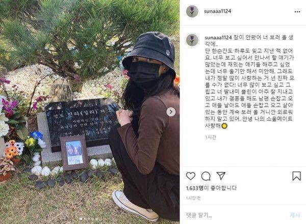 오늘(14일) 김선아는 자신의 인스타그램에 "잠이 안 왔어. 너 보러 올 생각에"라는 글과 함께 설리의 묘소에 방문한 사진을 올렸습니다.