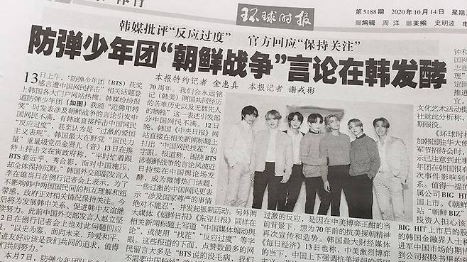 이후 환구시보 지면 뉴스에는 "BTS의 한국 전쟁 발언이 한국에서 부각되고 있다"는 제목에 한국 매체들이 '과도한 반응', 한국 정부는 '주목하고 있다'는 내용을 부제로 달았습니다.