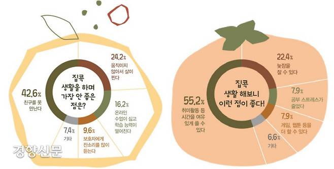 아이들은 코로나19로 ‘집콕’생활이 길어지면서 가장 안 좋은 점으로 ‘친구를 못 만나는 것(42.6%)’을 꼽았다. 움직이지 않아 살이 찐 것(24.2%)과 온라인 수업이 싫고 학습능력이 떨어지고 있는 점(16.2%)도 나쁜 점으로 꼽았다.