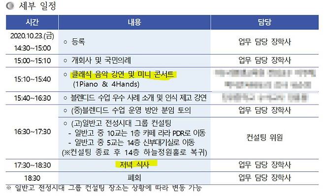 이 교육청이 만든 계획서를 보면 연수 시작과 함께 외부 음악가들을 초대해 '클래식 음악 강연과 미니 콘서트'를 30분가량 진행한다. 이어 '블렌디드(온오프라인 융합) 수업 우수 사례 소개' 시간 등을 1시간 50분가량 가진 뒤 곧바로 14층 홀에서 1시간에 걸쳐 만찬을 벌인다.