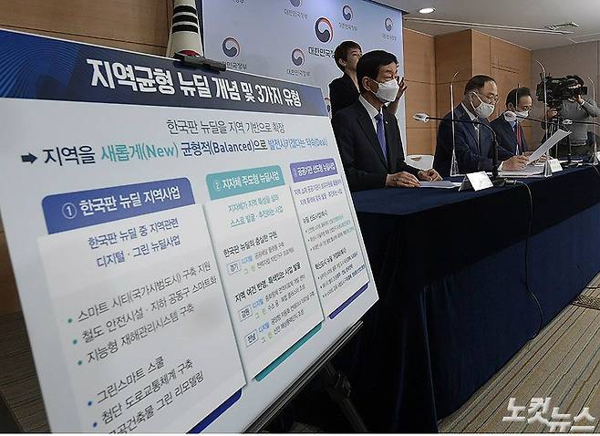 홍남기 경제부총리가 13일 정부서울청사에서 지역균형뉴딜 추진방안을 발표하고 있다. 왼쪽부터 진영 행정안전부 장관, 홍남기 경제부총리, 송하진 시도지사협의회 회장(전북지사). 정부는 2025년까지 민간 자본을 포함해 총 160조 원을 투입하는 초대형 국가 프로젝트 '한국판 뉴딜' 성공을 위해 지역의 적극적인 사업 참여를 대대적으로 추진한다고 밝혔다. (이한형 기자)