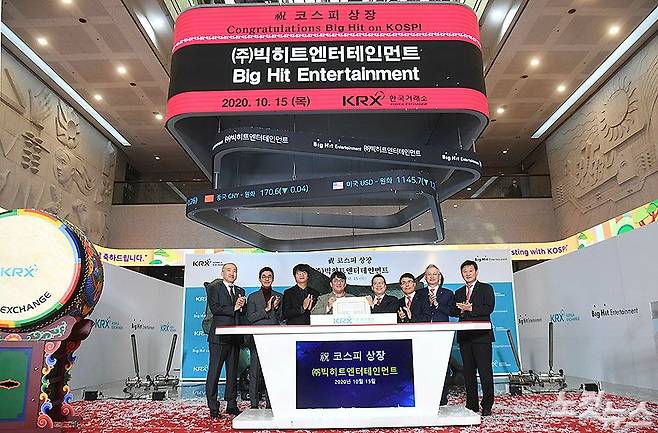 빅히트엔터테인먼트 코스피 상장 첫날인 15일 서울 여의도 한국거래소 1층 로비에서 빅히트의 상장 기념식이 열리고 있다. 이날 빅히트는 증시에 입성하자마자 상한가로 직행하며 '따상(시초가가 공모가의 2배로 결정된 뒤 상장 첫날 상한가)'으로 35만 1000원을 기록한 지 1분만에 급속도로 하락하며 25만 8000원에 거래를 마쳤다. (사진공동취재단)