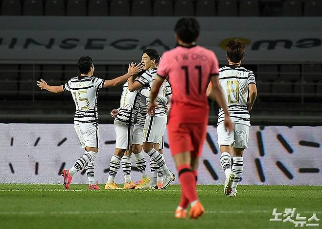 12일 경기도 고양종합운동장에서 열린 2020 하나은행컵 축구국가대표팀 vs 올림픽대표팀 2차전 후반경기에서 이동경이 선제골을 넣고 환호하고 있다. 파울루 벤투 감독이 이끄는 ‘형님’ 국가대표팀은 김학범 감독이 이끄는 ‘동생’ 올림픽대표팀에 3-0 완승을 거뒀다. (고양=이한형 기자)