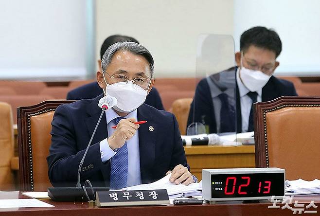모종화 병무청장이 13일 오전 국회 국방위원회에서 열린 국정감사에 출석해 의원들의 질의에 답하고 있다. 모 청장은 최근 뜨거운 논란이 된 ‘방탄소년단’(BTS)을 포함한 대중문화예술인의 병역 연기 허용 문제를 관련 부처와 협의하고 있다고 밝혔다. (윤창원 기자)