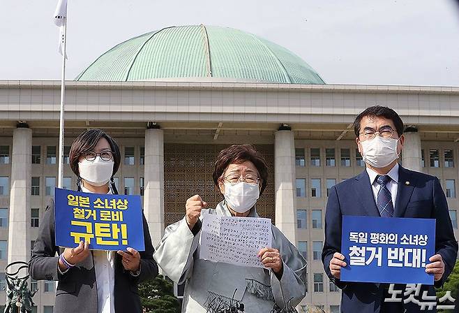일본군 위안부 피해자 이용수 할머니(가운데)가 14일 국회 본관 앞에서 독일의 '평화의 소녀상' 철거 명령 철회 촉구 기자회견을 하고 있다. 이용수 할머니는 주한독일대사관을 방문해 소녀상 철거 명령 철회 촉구서를 전달했다. (황진환 기자)