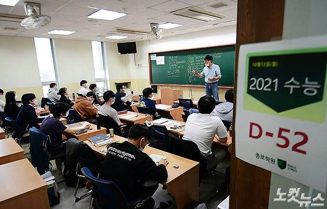 사회적 거리두기 1단계 하향 조정으로 대형학원 운영이 재개된 12일 오전 서울 강남구 종로학원 강남본원 재원생들이 수업을 듣고 있다. 이날부터 영업이 제한됐던 수도권의 클럽 등 유흥주점, 노래연습장, 대형학원(300인 이상), 뷔페식당 등이 문을 연다. (이한형 기자)