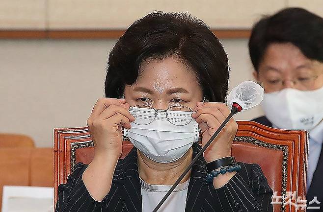 추미애 법무부장관이 12일 국회 법사위 법무부 국정감사에서 안경을 쓰고있다. 추 장관은 아들 서모씨를 둘러싼 군 복무 특혜 의혹에 "9개월 간의 전말을 생각해보면 상당히 어처구니가 없다" 며 "소설이 소설로 끝난 게 아니라 정말 장편 소설을 쓰려고 했구나 (생각한다)"고 말했다. (박종민 기자)