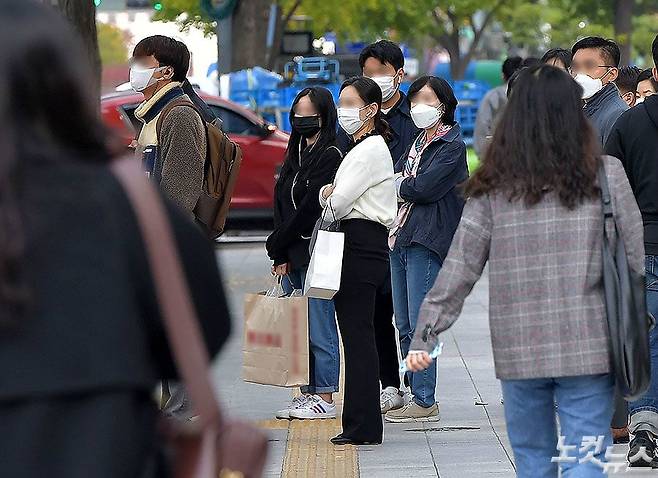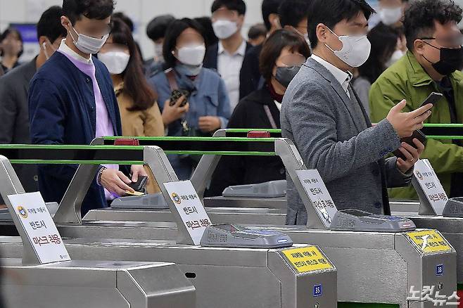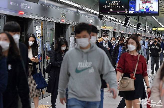 코로나19 예방을 위한 마스크 착용 의무화 첫 날인 13일 서울지하철 광화문역에서 마스크를 쓴 시민들이 발걸음을 옮기고 있다. 대중교통 및 의료기관에서는 반드시 마스크를 착용해야 하며 30일간의 계도기간을 거쳐 오는 11월 13일부터는 과태료 10만원을 부과한다. (박종민 기자)