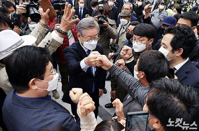 허위사실 공표 혐의로 기소돼 당선무효형에 처해졌다가 대법원에서 기사회생한 이재명 경기도지사가 16일 오전 수원고법에서 열린 파기환송심 선고공판에서 무죄를 선고받은 뒤 법원을 떠나며 지지자들과 인사나누고 있다. (수원=이한형 기자)