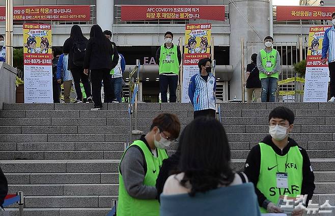 사회적 거리두기 1단계 하향 조정으로 스포츠관중 입장이 허용된 12일 경기도 고양종합운동장에서 열리는 2020 하나은행컵 축구국가대표팀 vs 올림픽대표팀 2차전 경기에 관중들이 입장하고 있다. (고양=이한형 기자)