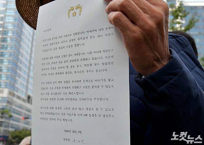 북한 피격 공무원 형 이래진 씨가 14일 인천 연수구 해양경찰청 앞에서 문재인 대통령이 A씨 아들에게 보낸 답장을 공개하고 있다. 아버지를 잃은 아들의 심정을 이해하며 깊은 위로의 마음을 전하며 진실을 밝혀내겠다는 내용이 담긴 a4 용지 한 장 분량의 문 대통령의 답장에 유족은 실망스럽다는 입장을 밝혔다. (인천=박종민 기자)
