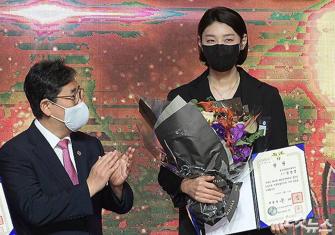 배구선수 김연경이 15일 서울 중구 더플라자호텔에서 열린 '제58회 대한민국체육상 시상식 및 2020 체육발전유공자 포상 전수식'에서 대한민국 체육상 경기상을 받고 기념촬영 하고 있다. 왼쪽은 박양우 문화체육관광부 장관. (이한형 기자)