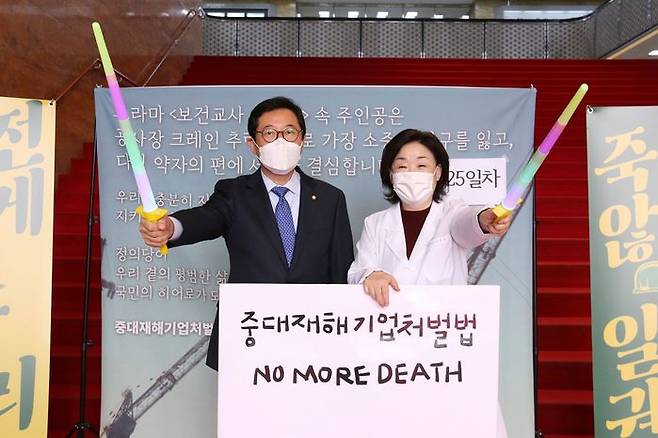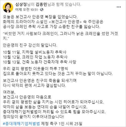 심 의원은 "'비쌌던 거지 사람보다 크레인이, 그러니까 낡은 크레인을 썼던 거겠지.' 안은영 친구 강선의 말입니다"라며 "친구의 죽음을 되새기며 약자의 편에 서고자 결심한 안은영의 마음으로 평범한 삶을 지키는 시민 히어로가 되어주십시오"라고 법안 처리를 호소했습니다.