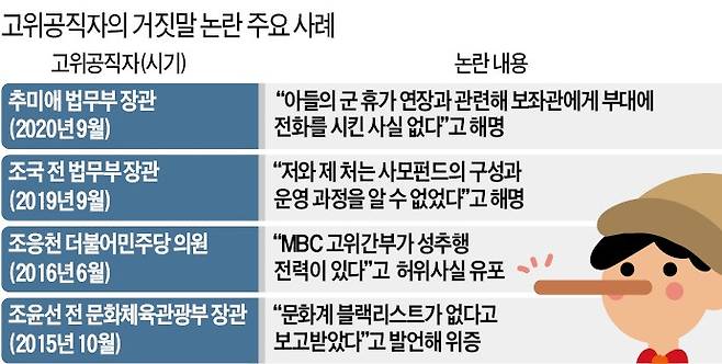 정창우 서울대 윤리교육과 교수는 “우리 사회가 목적을 달성하기 위해 거짓말을 사용하는 것에 둔감해지고 있다”며 “이런 현상이 고위공직자부터 일반 대중에 이르기까지 횡행하고 있다”고 진단했다. 추미애 법무부 장관과 조국 전 법무부 장관 등이 ‘거짓말 논란’에 휩싸인 게 대표적인 사례다. 추 장관은 아들의 군 휴가 미복귀 의혹과 관련해 국회에서 20여 차례 ‘거짓 해명’을 했다는 지적을 야당으로부터 받고 있다. 조 전 장관 역시 지난해 ‘사모펀드 의혹’ 등과 관련해 거짓 해명 논란에 휩싸였다.