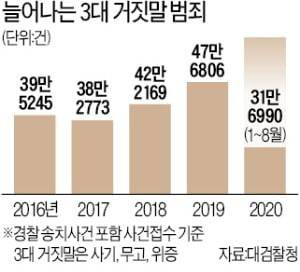 16일 대검찰청에 따르면 지난해 전국 검찰청에 접수된 사기·무고·위증 등 3대 거짓말 범죄는 총 47만6806건으로 역대 최다였다. 전년(42만2169건)보다 12.9% 증가했고, 2017년(38만2773건)과 비교하면 24.6% 늘었다. 올해 1~8월 3대 거짓말 범죄는 31만6990건이 접수됐다. 무고죄 기소율은 2016년 21.1%에서 지난해 11.6%로 떨어졌다. 근거 없이 상대방을 압박하기 위한 고소가 많아졌다는 의미다. 서울 서초동의 한 변호사는 “피의자가 잘못을 반성하기보다 무고죄를 걸어 상대방을 압박해 고소를 취하시키려는 사례가 많다”며 “이런 행위가 사회 전반의 신뢰 수준을 더 떨어뜨리고 있다”고 말했다.