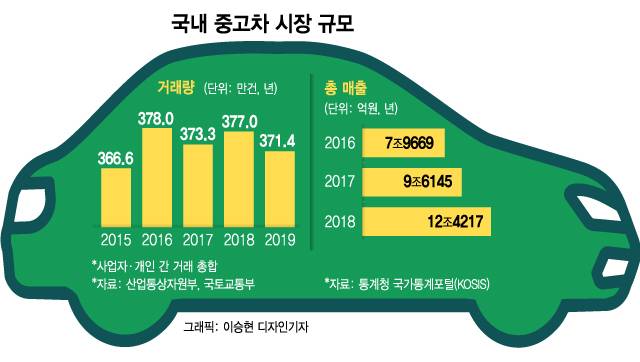 국내 신차 판매량(180만건)의 2배에 가까운 규모다. 통계청이 집계하는 전국 중고차 판매업의 총 매출액으로 따지면 2016년 약 8조원이던 시장 규모는 2018년엔 12조4000억원으로 커졌다.
