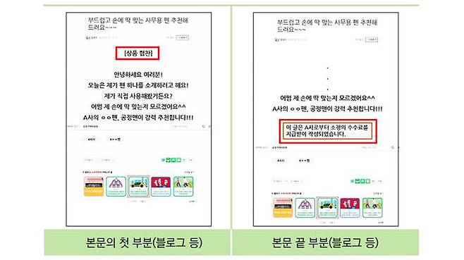 대가성 표기를 하긴 했지만 본문 배경색이나 희미한 색을 써 잘 안 보이게 한 경우와 대가성이 명확한 일부 문서에만 표기를 하고 대가의 종류가 다른 경우에는 표기를 생략하는 경우, 본인의 경험은 전혀 들어가지 않고 단순히 업체에서 일괄 전달한 원고와 이미지를 그대로 올리는 경우 등이 포함됩니다.
