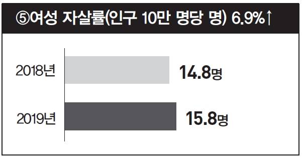 9월 22일 통계청이 발표한 '2019년 사망원인통계'에 따르면 지난해 자살자 수는 1만3799명이었다. 하루 평균 37.8명꼴이다. 자살률(10만 명당 자살 사망자 수)은 26.9명으로 2018년보다 0.9% 상승했다. 자살률은 2014년부터 2017년까지 4년 연속 하락하다가 2018년 5년 만에 상승세로 돌아섰다. 남성(38.0명)의 자살률이 여성(15.8명)의 2.4배에 이르렀다. 단, 남성은 전년과 비교해 자살률이 1.4% 하락했는데 여성은 6.7% 올랐다.