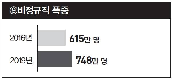 박근혜 정부 시기인 2013~2016년에는 비정규직 근로자 수가 594만 명, 607만 명, 601만 명, 615만 명이었다. 그러다 문재인 정부가 출범한 2017년 657만 명으로 급증하더니 2년 새 90만 명 이상 늘었다. 이에 강신욱 통계청장이 "조사 방식이 바뀌었기 때문에 과거와 비교하면 안 된다"고 강변하는 일까지 벌어졌다.