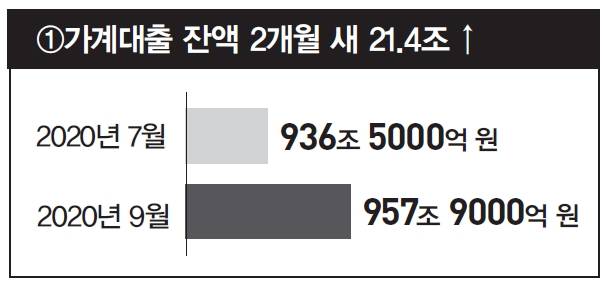 10월 13일 금융위원회와 금융감독원, 한국은행이 발표한 '2020년 9월 중 가계대출 동향(잠정)'은 '영끌 사회'의 맨 얼굴을 적나라하게 드러냈다. 지난 9월 은행의 가계대출 잔액은 전월 말과 비교해 9조6000억 원이 늘었다. 가계대출 증가액이 사상 최대치를 기록한 8월(11조7000억 원)에 이어 역대 두 번째 수준이다. 2개월 새 가계대출이 21조 원 넘게 폭증했다. 대한민국은 하루 3500억 원꼴로 가계대출이 늘고 있는 나라다.