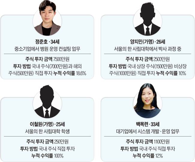 일확천금을 노리는 치기(稚氣)로 보기에는 그들의 자세가 사뭇 진지하다. ‘이코노미조선’이 2030세대 주식 투자자 네 명을 만났다. 20대 두 명은 학생, 30대 두 명은 직장인이다. 이들의 투자 금액은 250만원에서 7500만원에 이르기까지 다양했다. 수익률도 제각각이었으나 네 명 모두 “주식 투자를 계속할 것”이라고 입을 모았다. 많은 기회를 빼앗긴 젊은 세대에게 주식 투자는 얼마 남지 않은 생존 전략이라는 이유에서다.