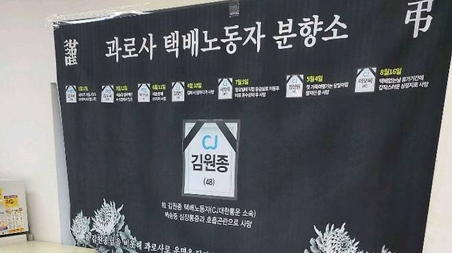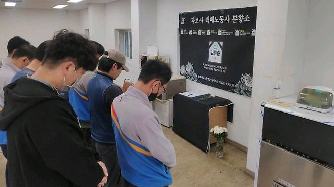 지난 8일 배송 중 쓰러져 숨진 CJ대한통운 소속 故 김원종 씨에 대해서 일부 점주들이 악의적인 소문을 퍼뜨린다는 제보도 이어졌습니다. 일부 점주들이 김 씨의 죽음에 대해 "팩트만 알리겠다"면서 김 씨의 산재 적용 제외 신청서를 대필한 것은 김 씨 본인의 요청에 따른 것이라거나, 고인이 주식 거래를 해 항상 오후 3시 30분까지 장을 본 후 배송에 임했다는 식으로 고인에 대한 확인되지 않은 사실을 퍼뜨리며 기사들에게 입단속을 종용하기도 했습니다. 사실상 김 씨에 대한 추모 분위기를 막는 것입니다. CJ대한통운 부산 우암터미널에선 동료들이 차린 추모 분향소와 영정이 강제 철거돼 쓰레기통에서 발견되기도 했습니다. 동료들은 인간 된 도리로서 이건 아니지 않냐고 되묻습니다.