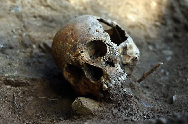 | ▲ 20일 드러난 뼛 더미 인근에서는 비교적 온전한 형태의 두개골이 발굴됐다. 골령골의 경우 놓은 산성도와 습기로 대부분의 유해가 삭아 없어진 상태다. |