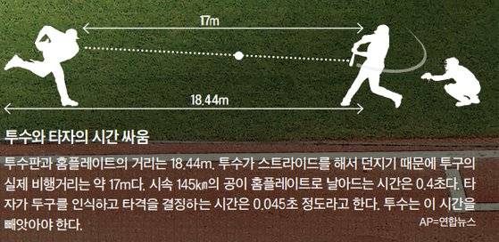 투수판과 홈플레이트의 거리는 18.44m다. 투수가 스트라이드를 해서 공을 던지기 때문에 릴리스 포인트와 타자의 히팅 포인트의 거리는 약 17m다. 어데어 교수는 투수가 시속 145㎞의 패스트볼을 던진다고 가정했다. 이에 따라 타자가 해야 할 일을 시간별로 계산했다.
