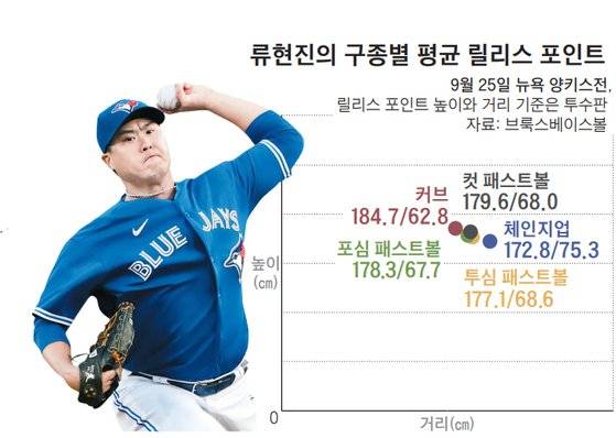 피치 터널은 '공간 싸움'이다. MLB 통계 전문 사이트 ‘브룩스베이스볼’을 보면 류현진의 릴리스 포인트는 일정하게 형성된 것을 볼 수 있다. 9월 25일 뉴욕 양키스전 데이터를 보면, 그의 릴리스 포인트 높이는 구종과 관계없이 180㎝ 선에서 거의 일정하다. 수평 릴리스 포인트는 약간의 차이가 있다. 몸에서 가장 가까운 포인트에서 던지는 커브(62.8㎝)와 가장 먼 체인지업(75.3㎝)의 차이는 최대 12.5㎝다. 이 정도 차이는 타자의 눈으로 식별하기 어렵다.
