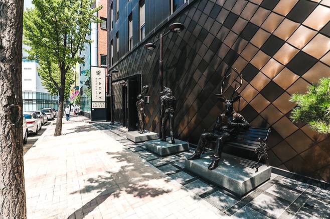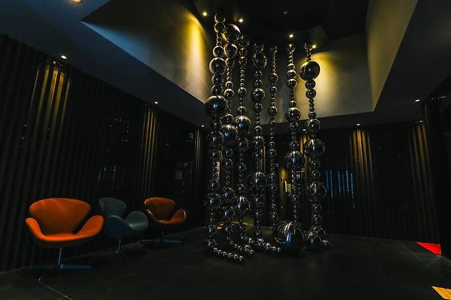 워낙 특이한 콘셉트로 꾸며져 있기 때문에 외관부터 흥미롭다. 벤치에 앉아 책을 보고 있는 사슴을 지나쳐, 해가 쨍쨍한 한낮에 문을 열고 들어갔더니 어느 밤중에 머물고 있는 로비가 등장했다. 저 멀리 반짝반짝 빛이 나는 구슬 모양 설치 미술작품이 가장 먼저 눈에 띈다.