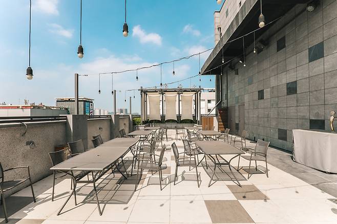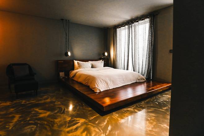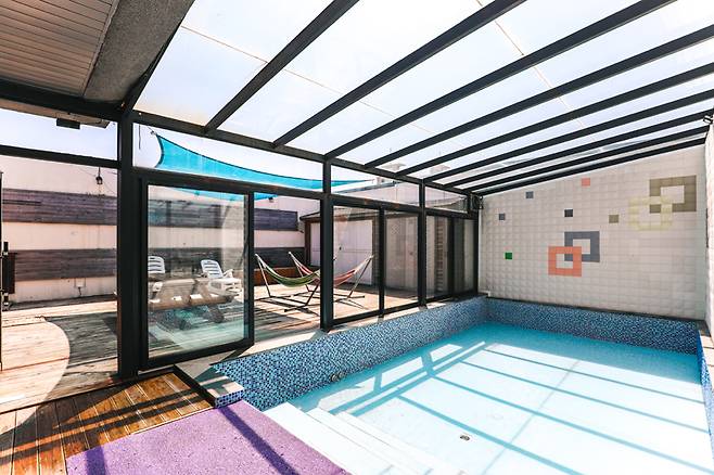 총 32개의 객실 중 주목해야 할 곳은 역시 펜트룸. 펜트룸에는 투숙객만 프라이빗하게 이용할 수 있는 야외 테라스 공간, 수영장이 마련되어 있다. 테라스 공간에서는 바비큐와 캠프파이어, 취사가 가능하다. 수영장의 경우 하루에 한 번씩 물을 갈며 청결에 힘을 쓰고 있다. 너른 침대에 누워 커튼 뒤 창밖으로 푸른빛 수영장이 넘실거린다. 도심 속에서 동남아시아 어느 풀빌라의 감성을 마음껏 누려 본다. 1층 로비에 자리한 카페에서는 무료로 조식을 제공한다. 토스트, 시리얼 등 아주 간단한 먹거리지만 그마저도 새롭게 느껴지는 것이 여행이다.