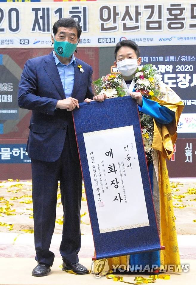(서울=연합뉴스) 21일 경기 안산시 안산올림픽체육관에서 열린 위더스제약 2020 민속씨름리그 2차 안산김홍도여자장사씨름대회 매화장사에 오른 이아란(안산시청)이 윤화섭 안산시장(왼쪽)과 함께 장사인증서를 들고 기념촬영을 하고 있다. 2020.10.21