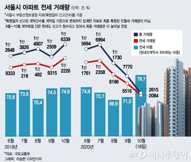 전월세 거래에서 전세가 차지하는 비중은 이달 들어 상승했다. 이달 18일 기준 서울 아파트 전월세 거래 중 전세 비중은 79.7%였다. 지난해 10월 74.8%보다 4.9%p(포인트) 높다. 지난 7월 31일 임대차2법(계약갱신청구권·전월세상한제)이 도입된 직후인 8월과 9월엔 전세 비중이 전년 대비 낮아졌지만 10월엔 오히려 상승했다.