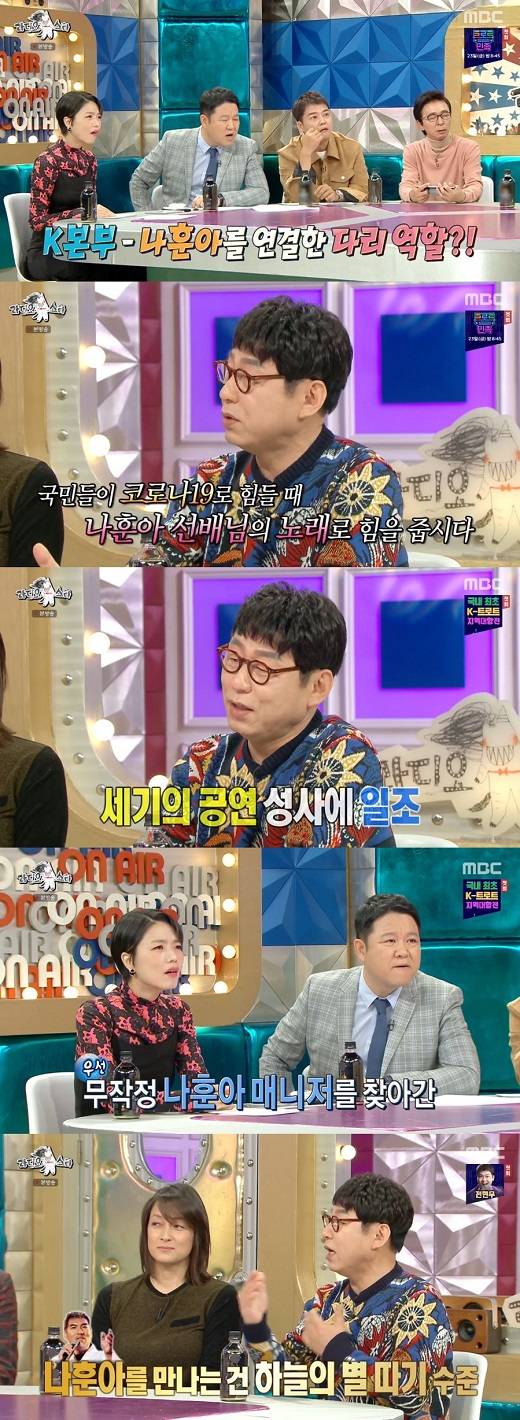 이어 "고민 끝에 나훈아 선배님 매니저의 집에 갔다. 나훈아 선배님을 만나는 것은 불가능했다. 국민들이 코로나19로 힘들 때 나훈아 선배님이 노래로 응원해줬으면 좋겠다고 했다. 안 한다고 하더라. 막걸리 세 통을 마시고 결국 해냈다. 그래서 나훈아 선배님이 나오게 된 거다"라고 덧붙여 놀라움을 자아냈다.