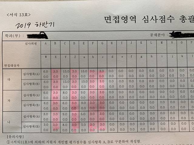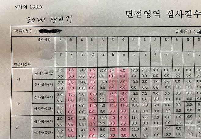 대학 측에서 익명 처리를 했어도 우연히 같은 알파벳으로 한 건지 어쨌든 이번에도 심사위원 가운데 B, D, F, G 4명의 점수가 거의 판박이 수준입니다. 달라진 건 2020년 상반기에는 마음에 드는 지원자가 있었는지 한 명에게 만점을 몰아주고 나머지 2명에게는 최하점으로 깔아(?)줬다는 겁니다.