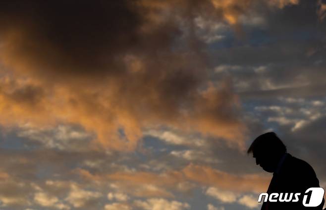 (샬럿 AFP=뉴스1) 우동명 기자 = 도널드 트럼프 미국 대통령이 21일(현지시각) 대선 경합 주인 노스캐롤라이나주 샬럿 더글라스 국제공항에서 전용기를 내리고 있다.