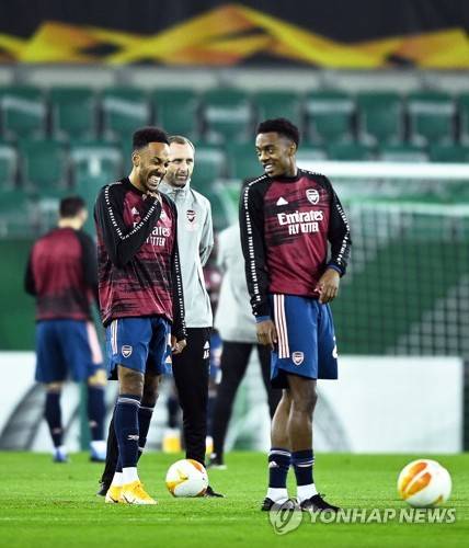 epa08765340 Arsenal players Pierre-Emerick Aubameyang (L) and Hector Bellerin (R) warm up for the UEFA Europa League group B soccer match between SK Rapid Vienna and Arsenal FC in Vienna, Austria, 22 October 2020. EPA/CHRISTIAN BRUNA