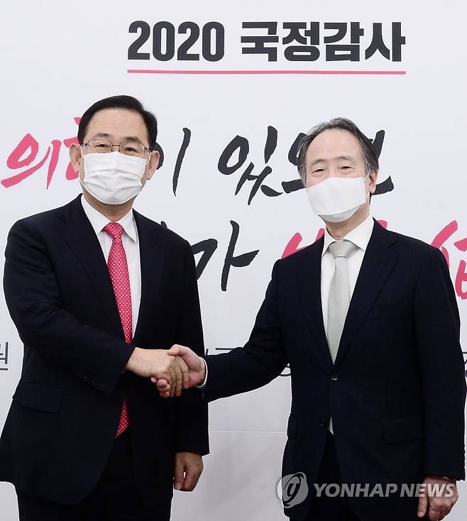 (서울=연합뉴스) 하사헌 기자 = 국민의힘 주호영 원내대표가 23일 오후 서울 여의도 국회에서 도미타 고지 주한 일본대사의 예방을 받고 악수하고 있다. 2020.10.23