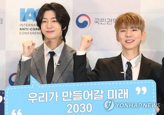 (서울=연합뉴스) 강민지 기자 = 그룹 몬스타엑스의 형원(왼쪽부터), 기현이 23일 서울 강남구 코엑스에서 열린 '제19차 국제반부패회의(IACC) 홍보대사 위촉식'에서 기념촬영하고 있다. 2020.10.23
