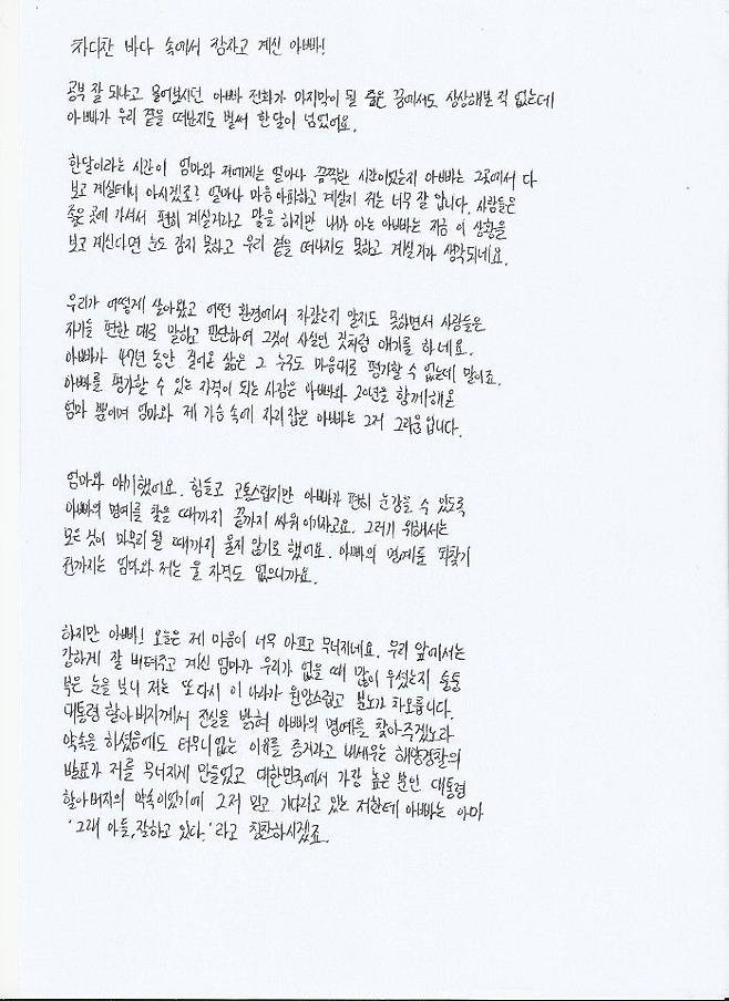 이어 "고통스럽겠지만 아빠가 편히 눈감을 수 있도록 아빠의 명예를 찾을 때까지 끝까지 싸워 이기겠다"며 "터무니없는 이유를 증거로 내세우는 해양경찰의 발표가 저를 무너지게 만든다"고 밝혔습니다.