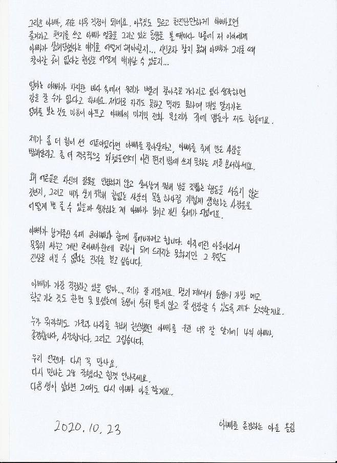 이 씨의 아들은 자필로 작성한 편지에서 "공부 잘되냐고 물어보시던 아빠 전화가 마지막이 될 줄은 꿈에도 상상해 본 적 없는데 아빠가 우리 곁을 떠난 지도 벌써 한 달이 넘었다"고 전했습니다.