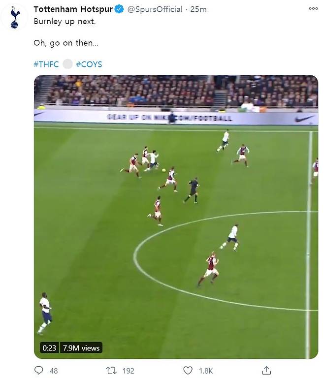 토트넘은 24일 공식 트위터를 통해 다음 상대 번리에 맞춰 그가 기록했던 70m 단독 돌파에 이은 골 장면을 다시 한 번 소개했다.