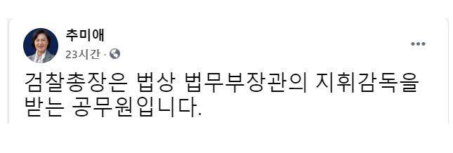 당시 윤 총장 발언이 크게 보도되자, 추 장관은 개인 페이스북을 통해 "검찰총장은 법무부 장관의 지휘 감독 받는 공무원"이라는 입장을 즉시 밝혔고, 몇 시간 뒤 "대검 국정감사에서의 논란과 관련해 감찰하겠다"고 재차 경고의 메시지를 내놓았습니다.