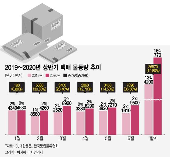 23일 한국통합물류협회에 따르면 올해 1~6월 누적 국내 택배물동량은 16억770만개로 지난해 같은 기간 13억4200만개보다 19.8%(2억6570만개) 급증했다.