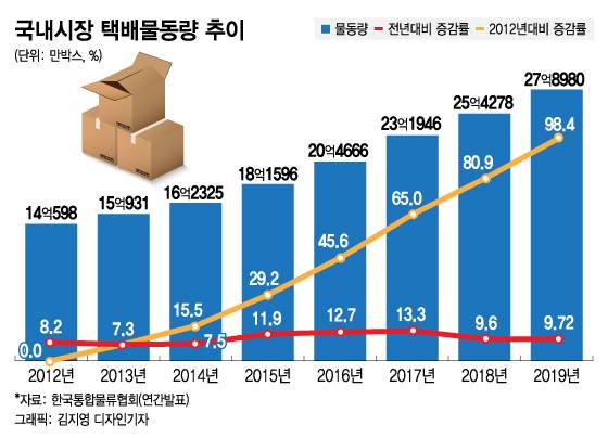 택배는 온라인 쇼핑 활성화 등으로 연 평균 10%가량 성장했으나 올해는 성장세가 더 가파르다. '코로나19' 확산으로 인한 비대면 소비가 급증해서다. 올해 물동량은 2012년(14억개)의 두 배를 넘길 것으로 예상된다.