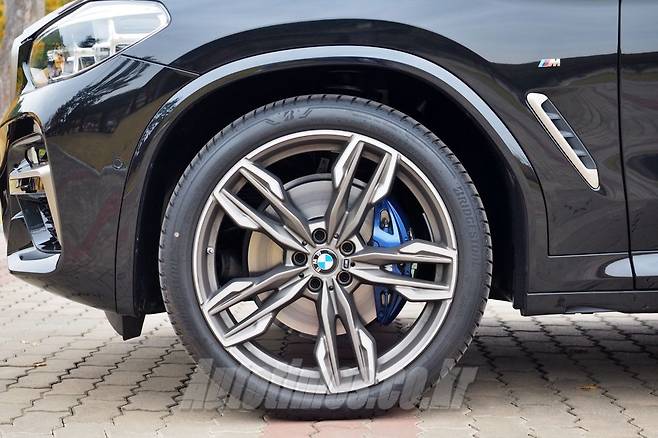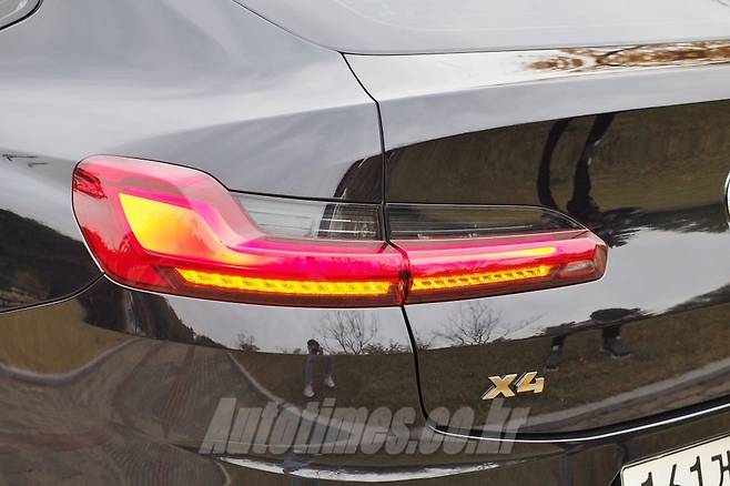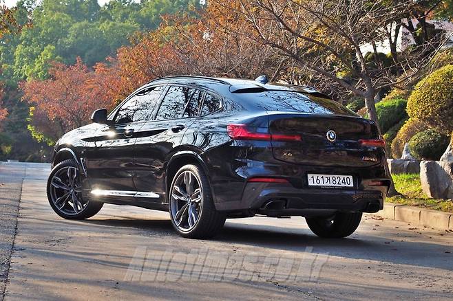 옆은 쿠페형 SUV가 보여줄 수 있는 아름다운 루프라인을 바탕으로 고성능 이미지를 곳곳에 넣었다. 거대한 21인치 더블 스포크 718 M 휠(X4 M40d와 같다)과 파란색 M 스포츠 브레이크, 차체 컬러와 맞춘 휠 하우스가 대표적이다. 반짝거리는 크롬 도금은 전부 지우고 무광 형태로 마감해 고급스러운 감각을 키웠다.