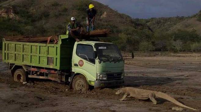 26일 비스니스 등 현지 매체에 따르면 지난 주말 린카섬 로흐 부아야리조트 공사 현장에서 트럭과 마주한 코모도왕도마뱀 사진이 트위터 등을 통해 퍼졌습니다.