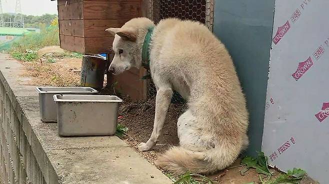 유기견이 있는 우리 안은 치우지 않은 배설물로 가득 찼고 사료통에 든 사료에는 바닥에 깔아둔 톱밥이 섞여 있습니다.